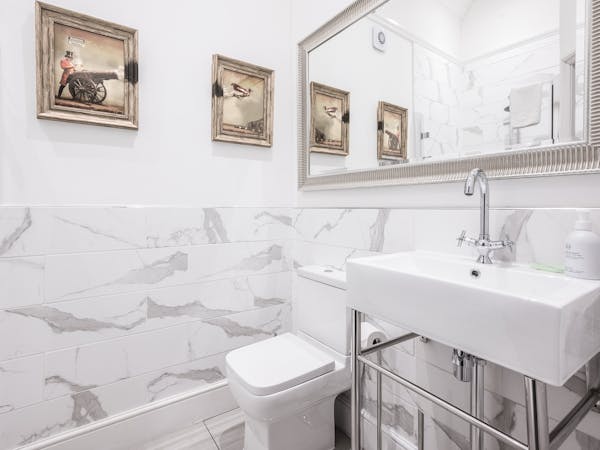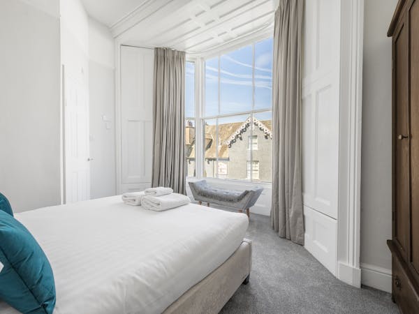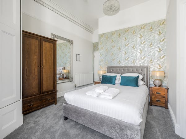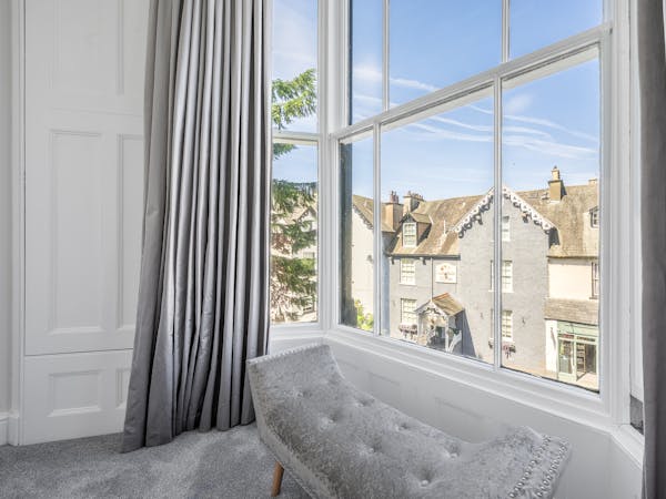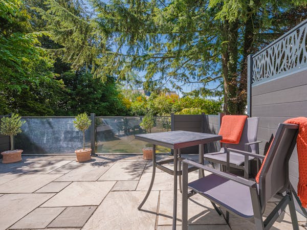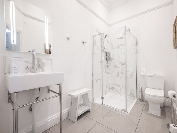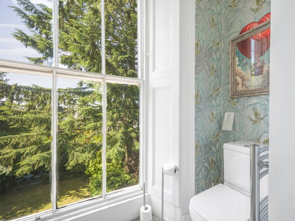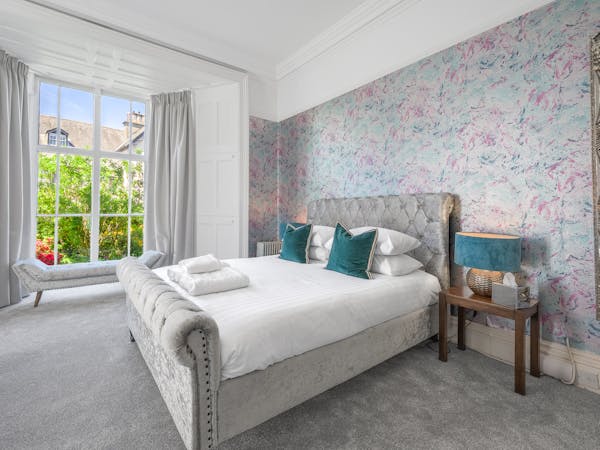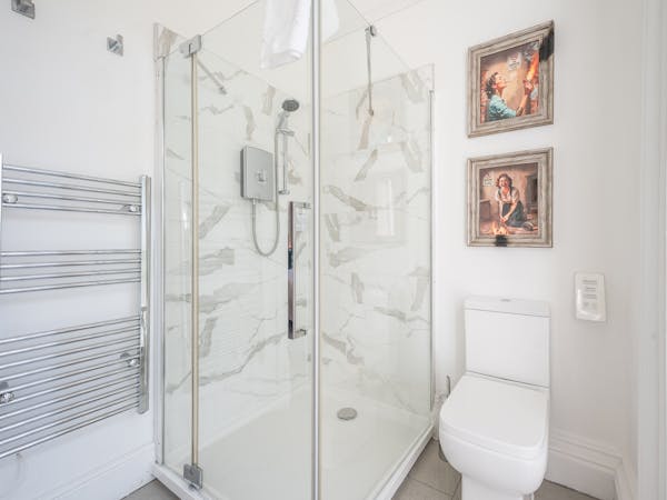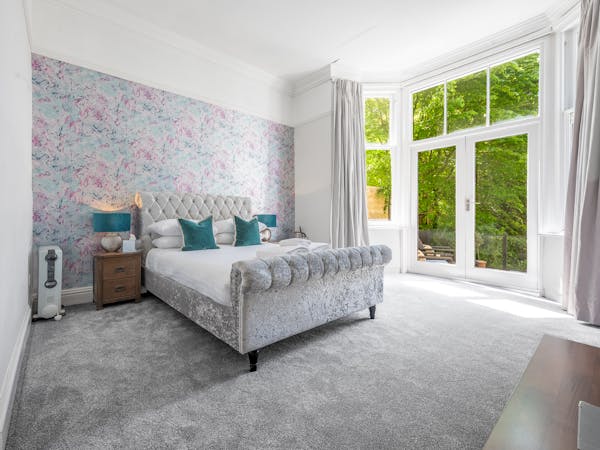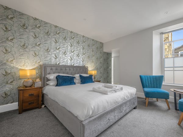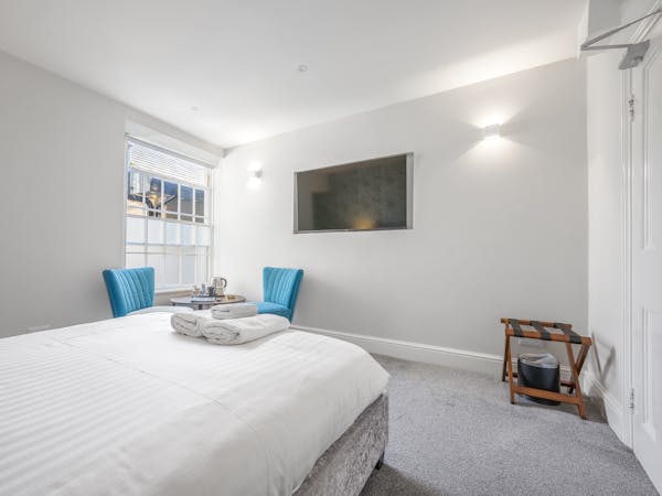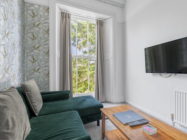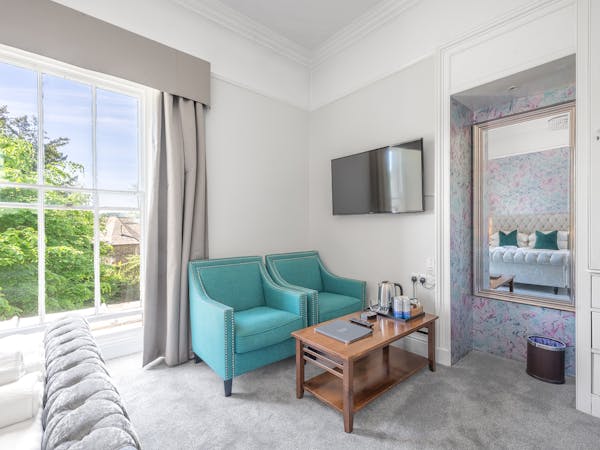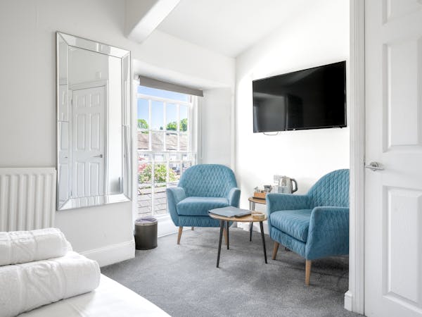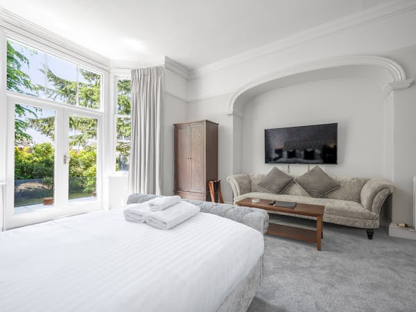 Our spacious upstairs Suite has its own private Snug and a spacious separate bedroom area and En-Suite, both overlooking the garden with large floor to ceiling windows, flat-screen TV's in both rooms and complimentary tea, coffee and biscuits.