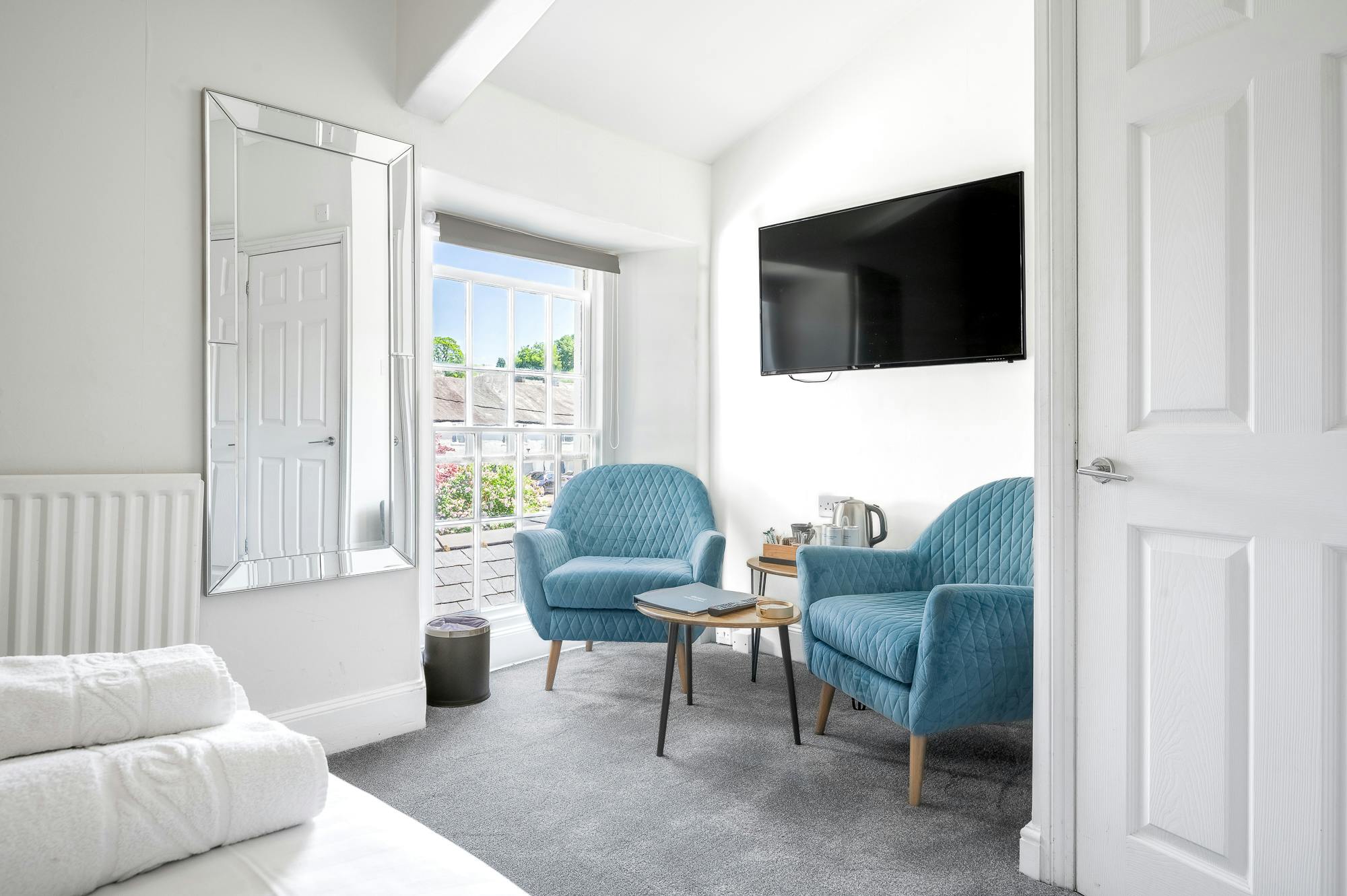 Our Superior Double Rooms each have a spacious seating area overlooking the Guest House grounds and feature a large flat screen TV and complimentary tea, coffee and biscuits.
